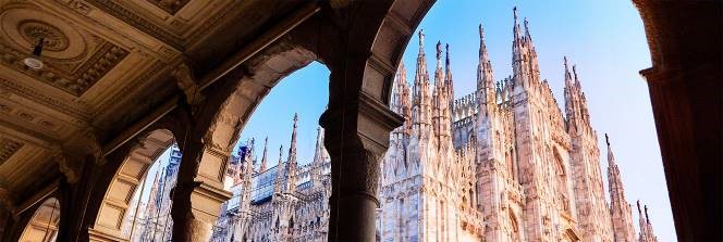 Ville active, généreuse, à l’avant-garde, capitale de la mode et des défilées, salons des vanités : les mystères et les trésors du Dôme (une forêt de flèches gothiques), Galerie Vittorio Emmanuel, la place du théâtre La Scala (le théâtre lyrique le plus célèbre du monde, où la musique a pris sa résidence), le Château Sforzesco au profil imposant qui est l’un des symboles de la ville (extérieurs).