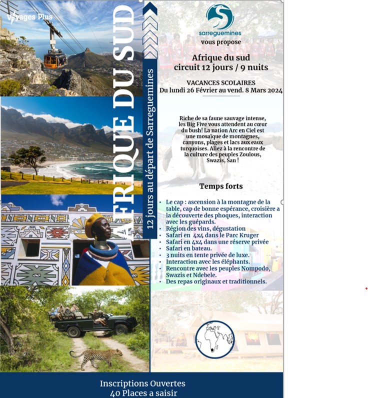 . Les assurances assistance – maladie – rapatriement – annulation incluant les épidémies dont la COVID 19 d‘Ares, une réunion d’information dans vos locaux, avant le départ, un carnet de voyage complet, par couple, incluant un mini-guide sur l’Afrique du Sud, la garantie totale des fonds déposés par le client auprès de Groupama.