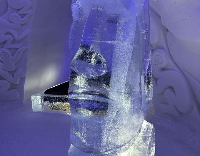 Départ en direction de Lainio, le village de glace. La sculpture de neige est une activité dans laquelle excellent les Finlandais. Il faut dire qu’ils ne manquent pas de matière première ! La discipline a été poussée à l’extrême avec la construction d’un village de glace, une curiosité à ne pas manquer. Le Snow Village couvre une superficie d’environ 20 000 mètres carrés. Environ 1,5 million de kilos de neige et 300 000 kilos de glace cristalline naturelle sont utilisés chaque année pour sa construction. La conception architecturale et le thème des décorations intérieures varient chaque saison, pour le plaisir des artistes qui laissent libre cours à leur imagination et leur talent. Le site se compose d’un lieu d’exposition, d’un hôtel, d’un restaurant et d’un bar, tous de glace.